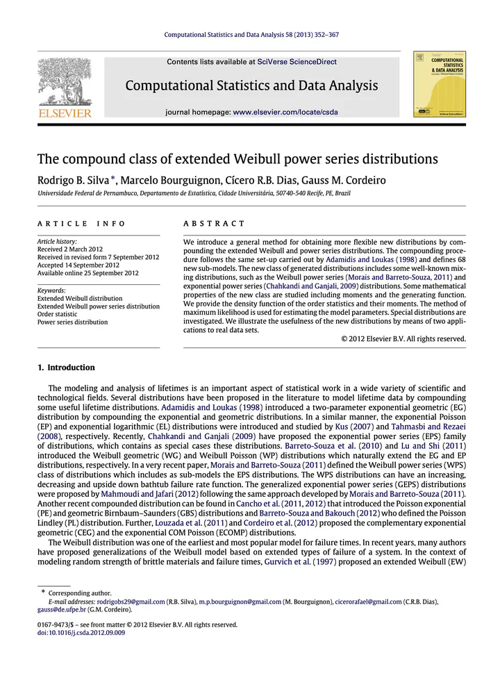The compound class of extended Weibull power series distributions Rodrigo B. Silva, Marcelo Bourguignon, Cícero R.B. Dias, Gauss M. Cordeiro jul. 21, 2013 PDF DOI Extended Weibull distribution Extended Weibull power series distribution Order statistic Power series distribution Marcelo Bourguignon Professor de Estatística Bolsista de Produtividade 2 do CNPq. Elected Member do International Statistical Institute (ISI). Detentor dos prêmios Jan Tinbergen Awards (2017), New Researcher Travel Award (2019), ISI Young Ambassador (2022), IBS Young Ambassador (2023) e IASC Data Analysis Competition 2023. Possui mais de 100 artigos publicados.