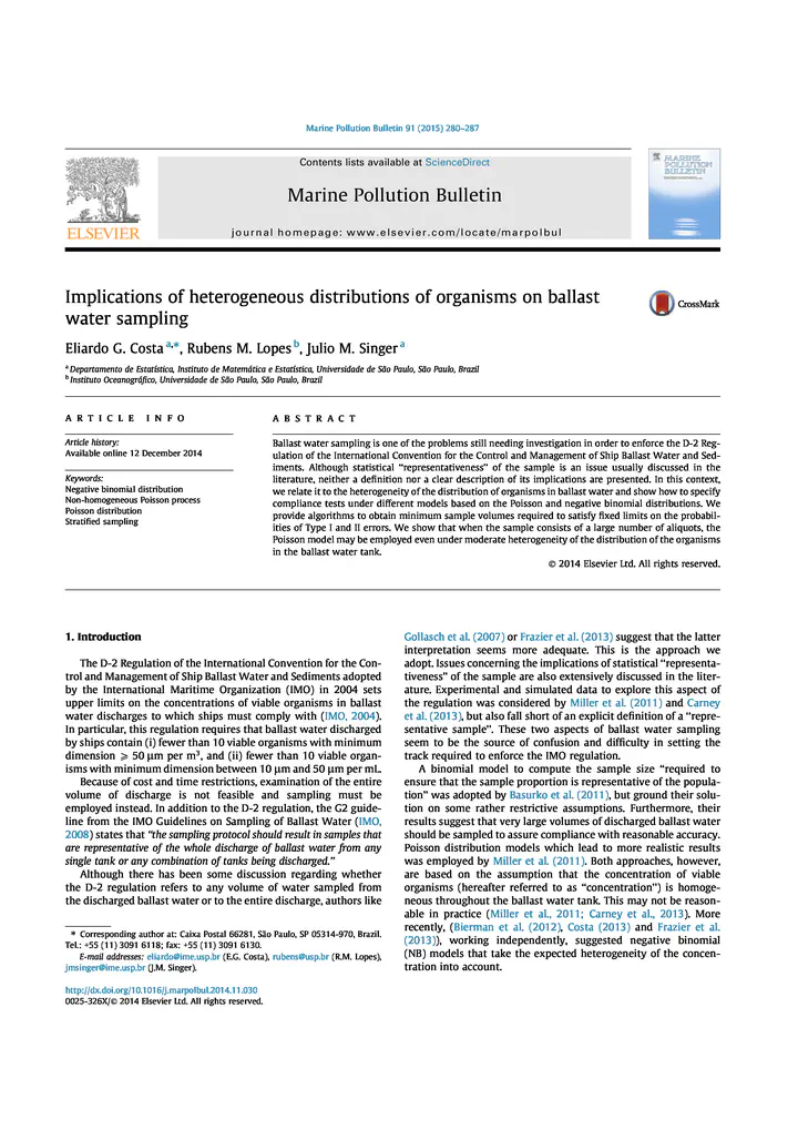 Implications of heterogeneous distributions of organisms on ballast water sampling Eliardo G. Costa, Rubens M. Lopes, Julio M. Singer dez. 12, 2014 PDF DOI Negative binomial distribution Non-homogeneous Poisson process Poisson distribution Stratified sampling Eliardo G. Costa Professor de Estatística Professor do Departamento de Estatística da Universidade Federal do Rio Grande do Norte. Tem interesse tanto nos fundamentos teóricos da Estatística como na sua aplicação nas mais diversas áreas da ciência.
