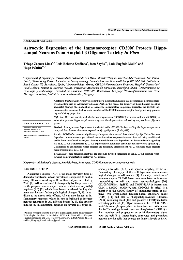 Astrocytic Expression of the Immunoreceptor CD300f Protects Hippocampal Neurons from Amyloid-β Oligomer Toxicity In Vitro