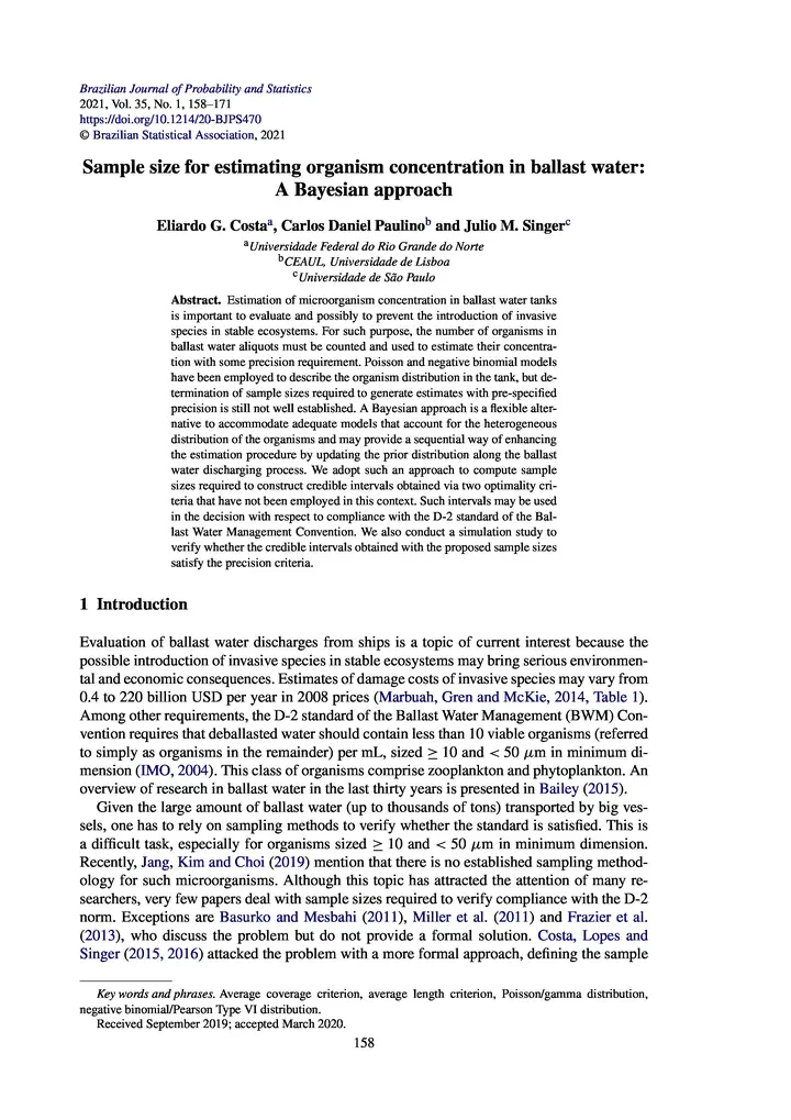 Sample size for estimating organism concentration in ballast water: A Bayesian approach Eliardo G. Costa, Carlos Daniel Paulino, Julio M. Singer fev. 1, 2021 PDF DOI Average coverage criterion Average length criterion Poisson/gamma distribution Negative binomial/Pearson Type VI distribution Eliardo G. Costa Professor de Estatística Professor do Departamento de Estatística da Universidade Federal do Rio Grande do Norte. Tem interesse tanto nos fundamentos teóricos da Estatística como na sua aplicação nas mais diversas áreas da ciência.